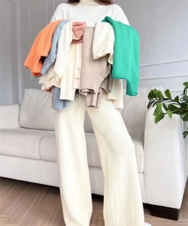 Autumn Winter 2 Pieces Women Sets Knitted Tracksuit Turtleneck Sweater and Straight Jogging Pants Suits