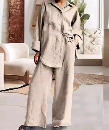 Autumn New Women’s Long Sleeve Shirt 2 Piece Set Simple Elegant Solid Color Lapel Single Breasted Shirt Loose Straight Pant Suit