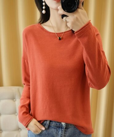 100% Cotton Women Knit Sweater Crimped Edge O-Neck Pullover Bottoming Pure Cotton Sweater Spring Autumn New Tops Clothes