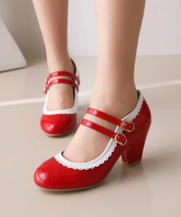 Pink Patent Leather Double Ankle Strap Mary Janes Women High Block Heels White Purple Bordered Sweet Dress Lady Round Toe Pumps