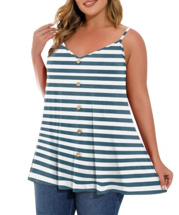 Plus Size Ladies summer loose camisole casual striped printed camisole vest adjustable shoulder straps button sleeveless top