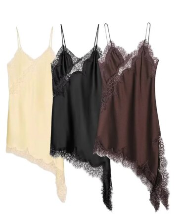 Satin Lace Spliced Short Sling Dress Women Sleeveless Backless Asymmetric Party Dresses 2025 Summer Lady Dress