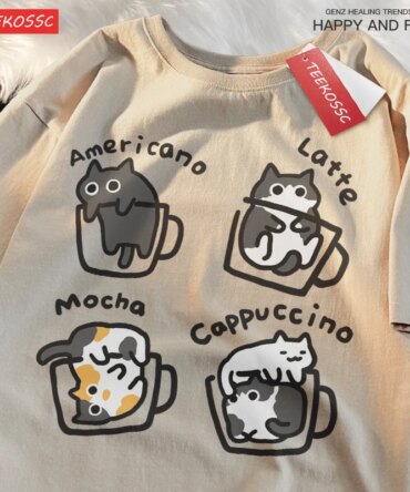 Cat Coffee Pure Cotton Trendy Summer Loose Short Sleeved T-shirt Men Women Original Mocha Latte Cat Three Flowers Fun Cat Tees
