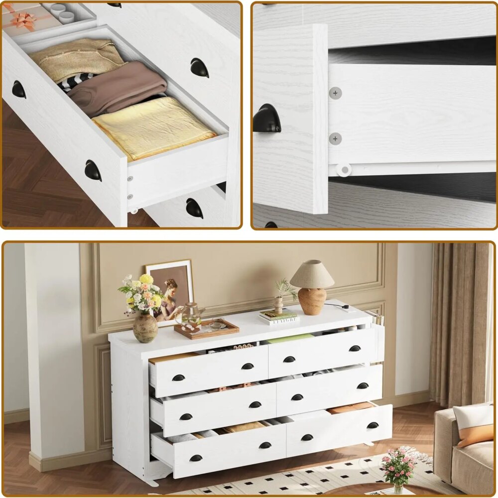 LIKIMIO Dresser for Bedroom 6 Drawer with Charging Station, 59 Inches White, TV Stand Storage Chest of Drawers for Living Room