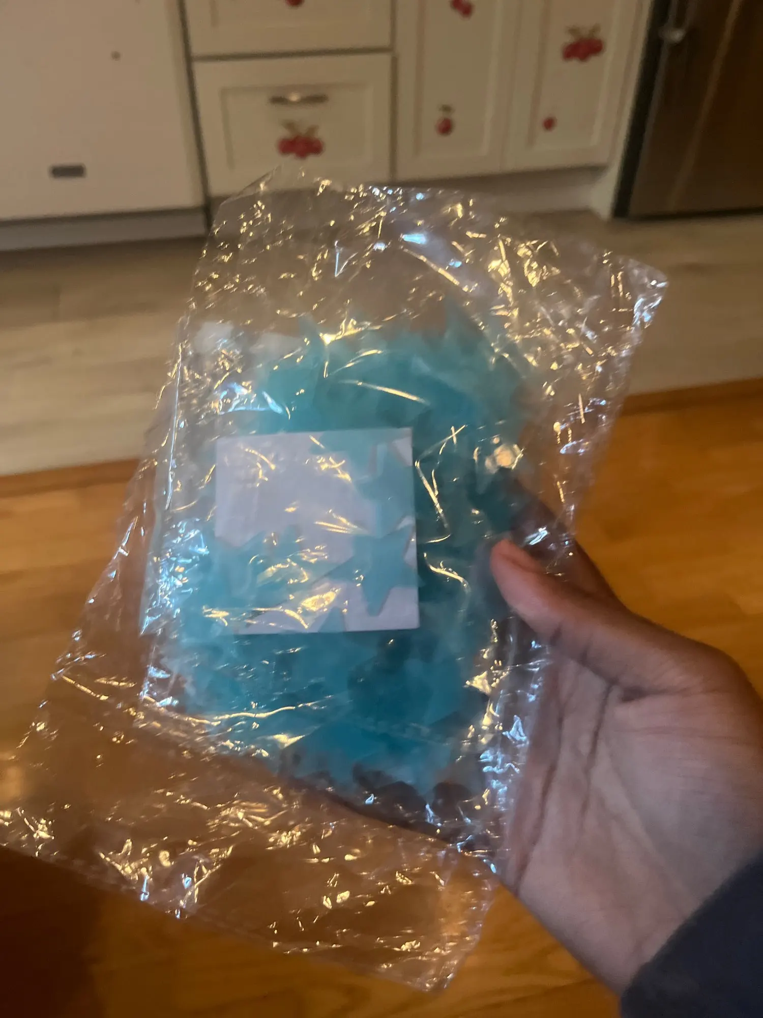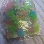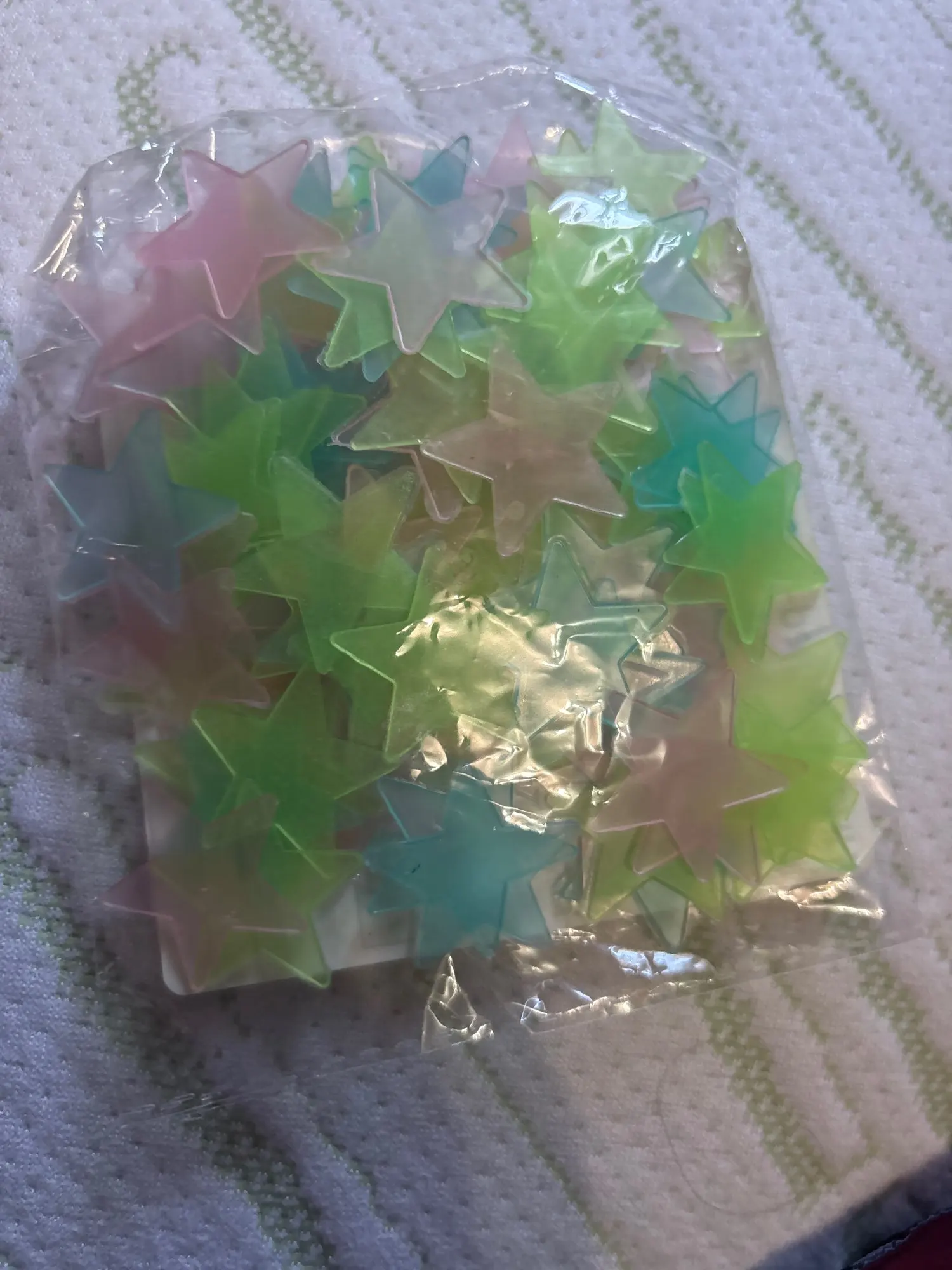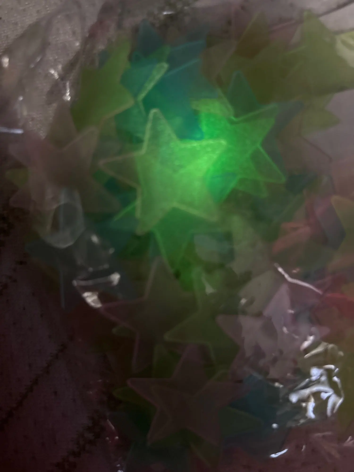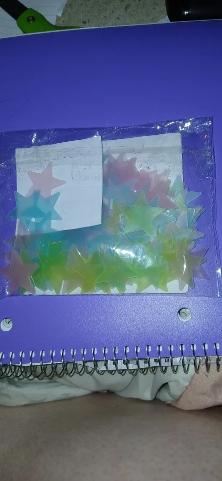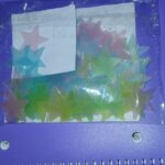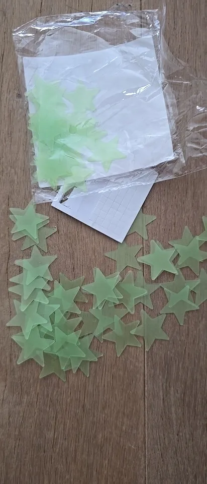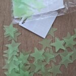 Very small stars and double-sided tape that makes it very difficult to peel off from the paper. For this – 1 star rating. At night, they reflect light. Shipping is fast, everything is fine. Thank you.