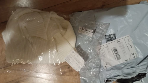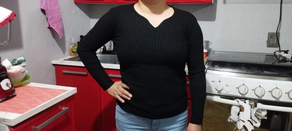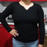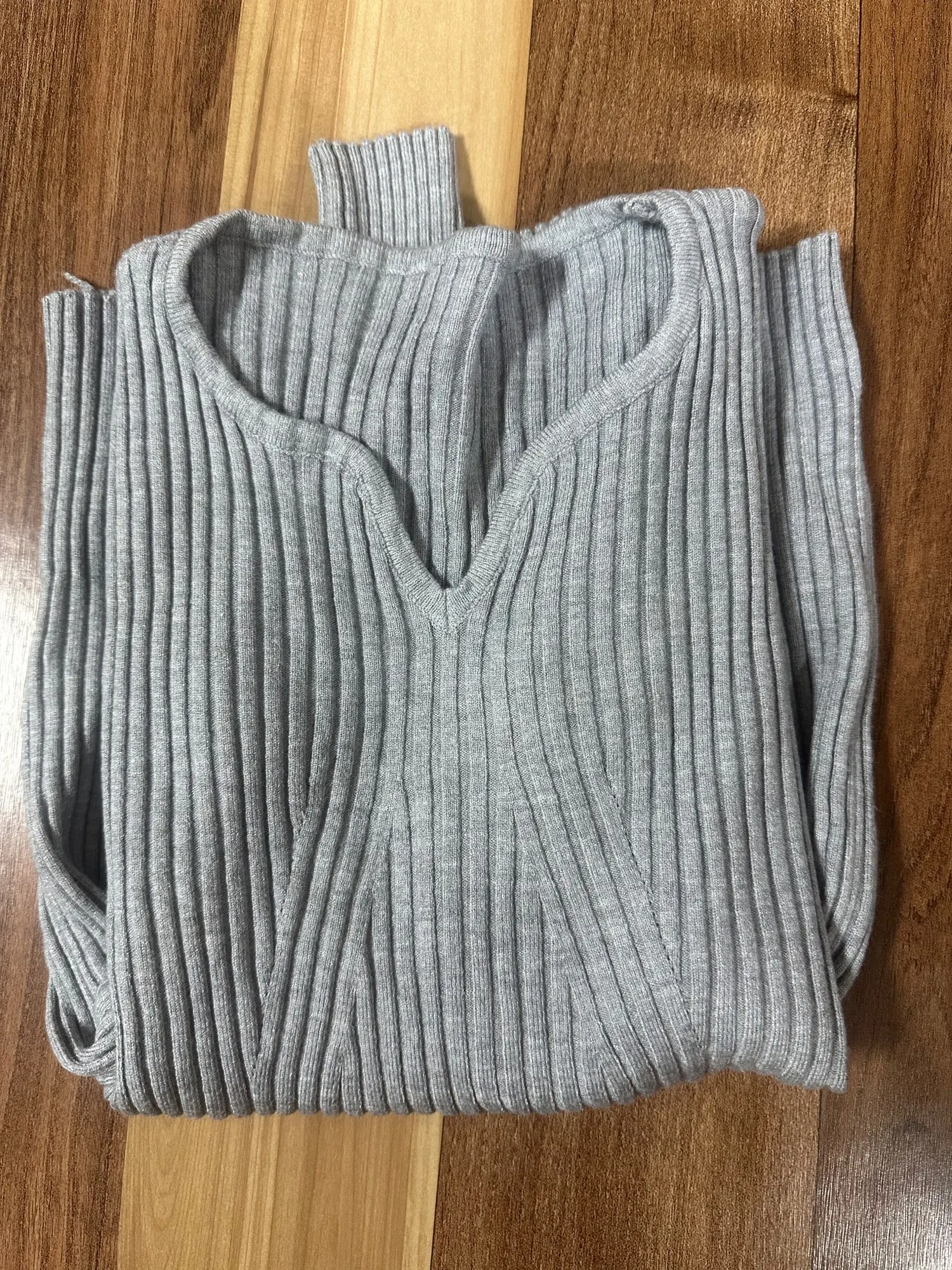 The ribbed material is warm, and the neckline shape is very neat. The length reaches the waist, which is great! The necklace looks nice too and it’s the ideal shape! I usually wear L size, but I could wear it without any issues! It makes me look slimmer!