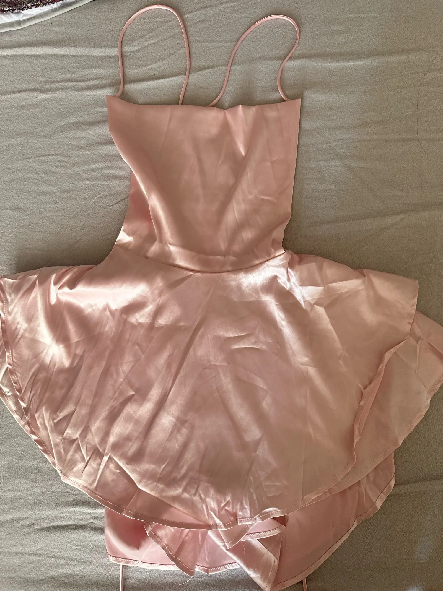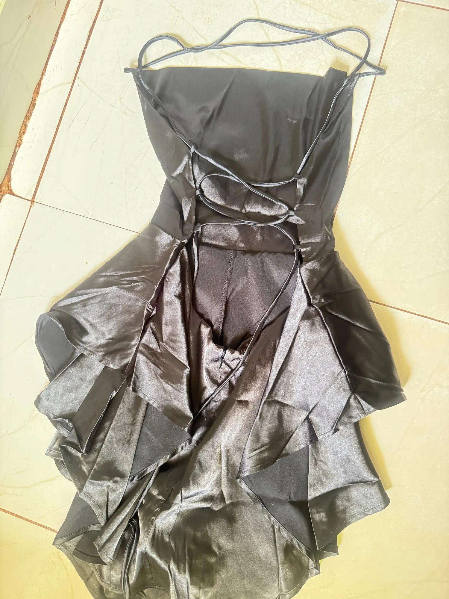 The dress arrived very quickly and before the delivery date. It’s a bit crooked in the chest area and too loose in the back, but I can manage with that.