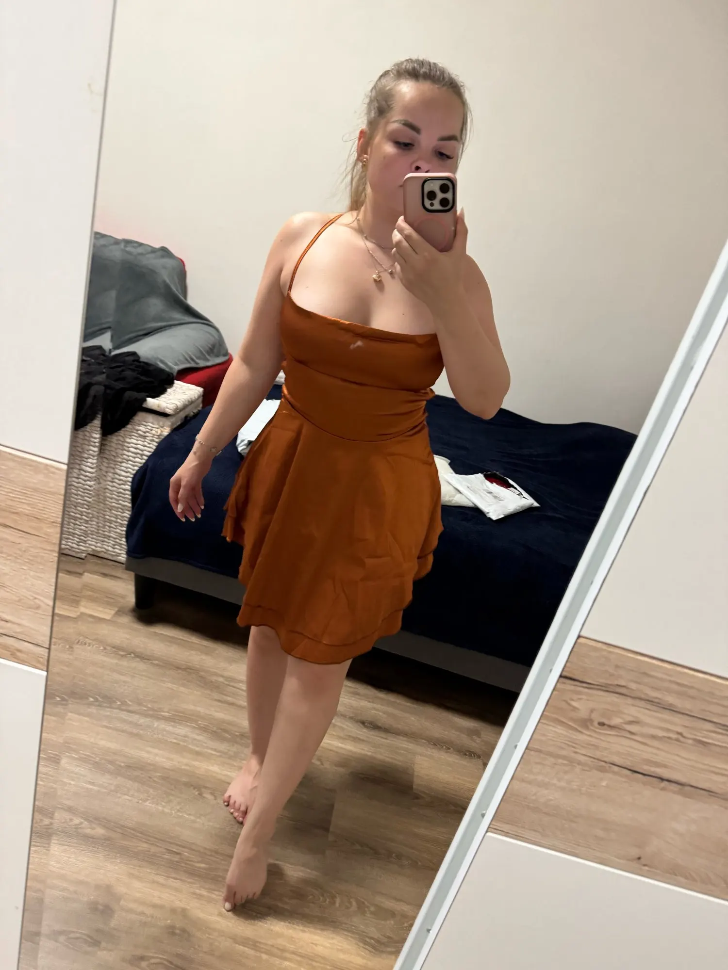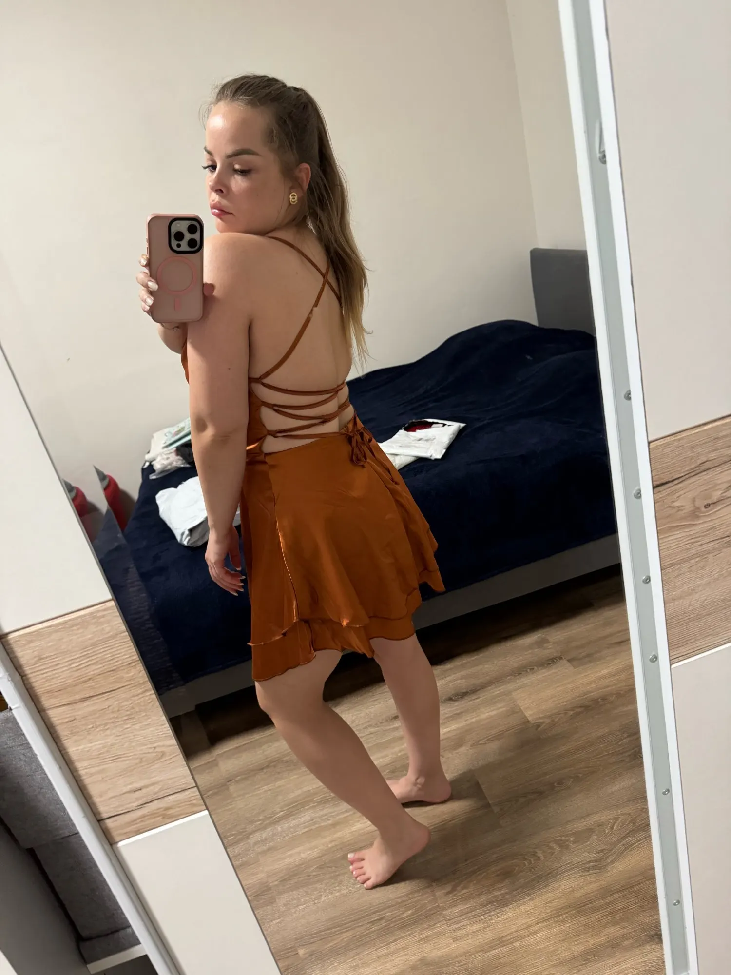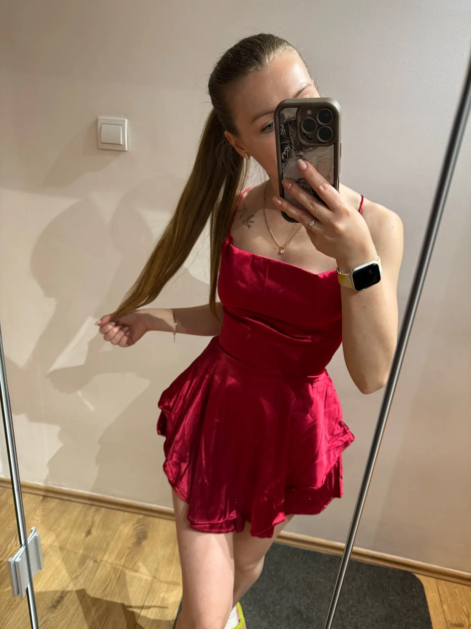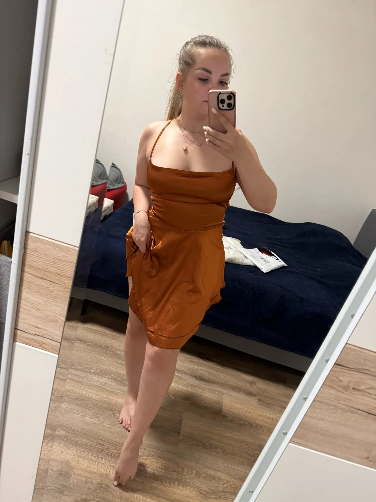 Just picked it up, immediately tried it on without ironing, ordered another Ukrainian-made one. I can say that this is sewn much better, the color is more burgundy and pinkish, great for girls with a cool undertone. Very satisfied with this dress, it fits like in the pictures, true to size. 🍑 Damn, how it poured. Arrived quickly