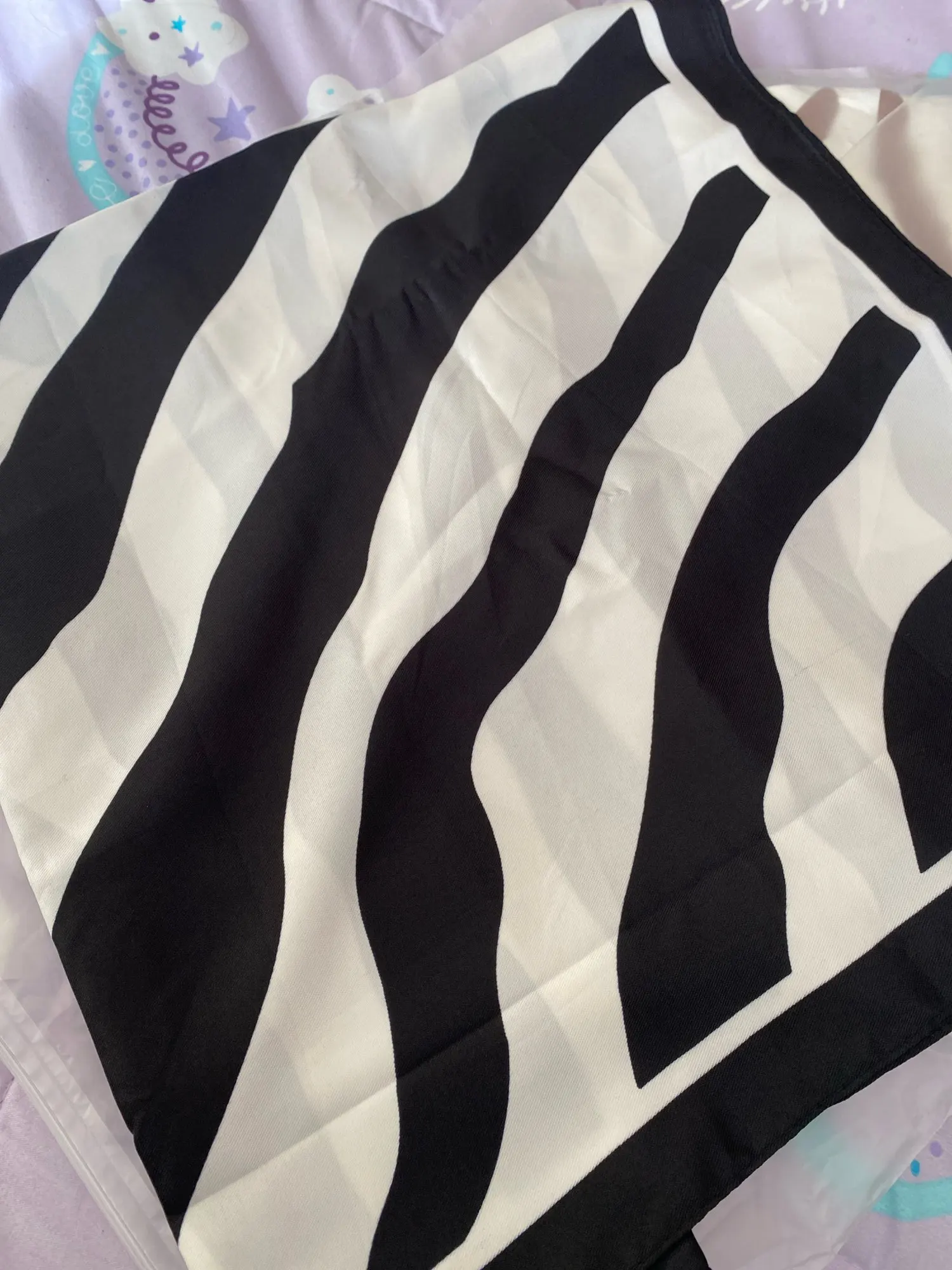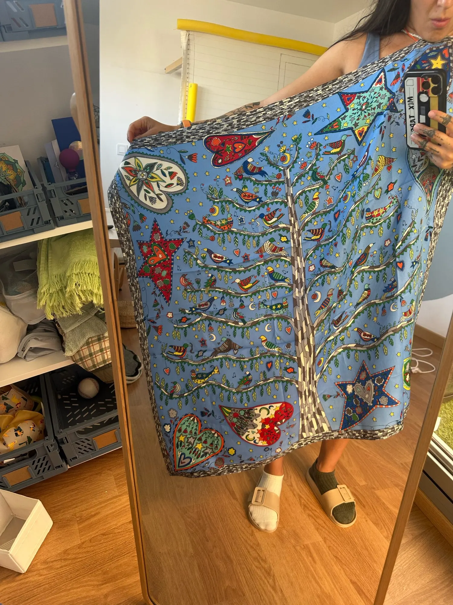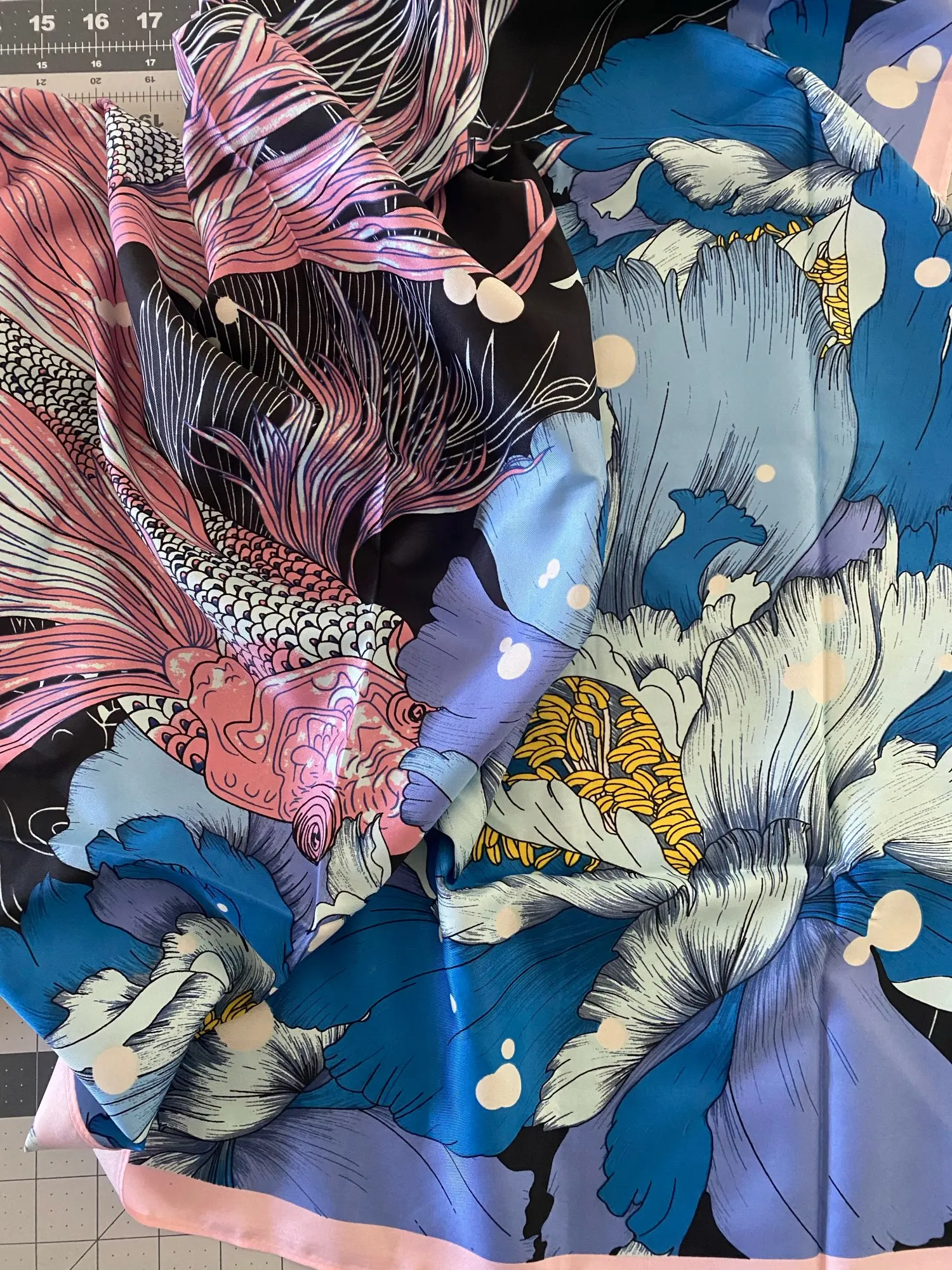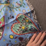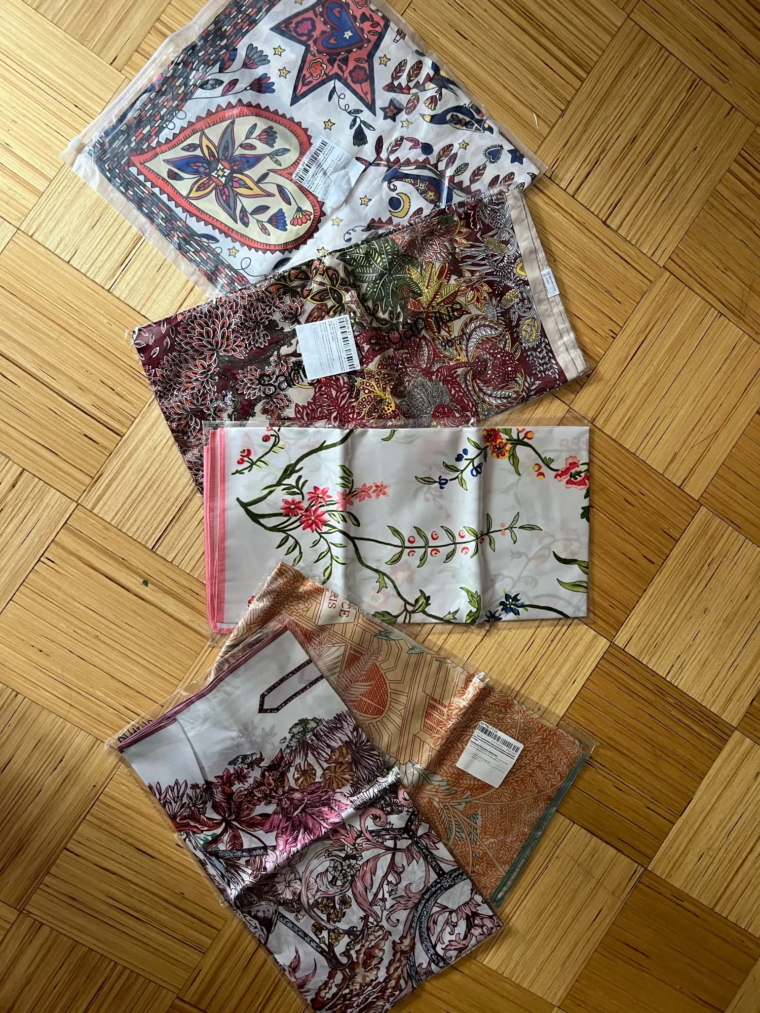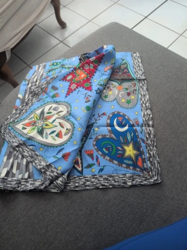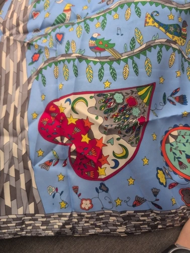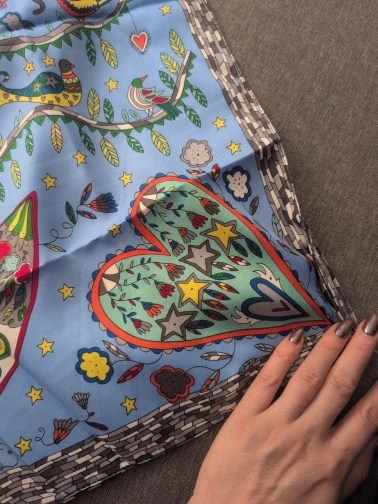 The scarf is beautiful but it’s not silk; it’s a bit dark and the pattern is slightly blurry, but for this price it’s okay.