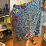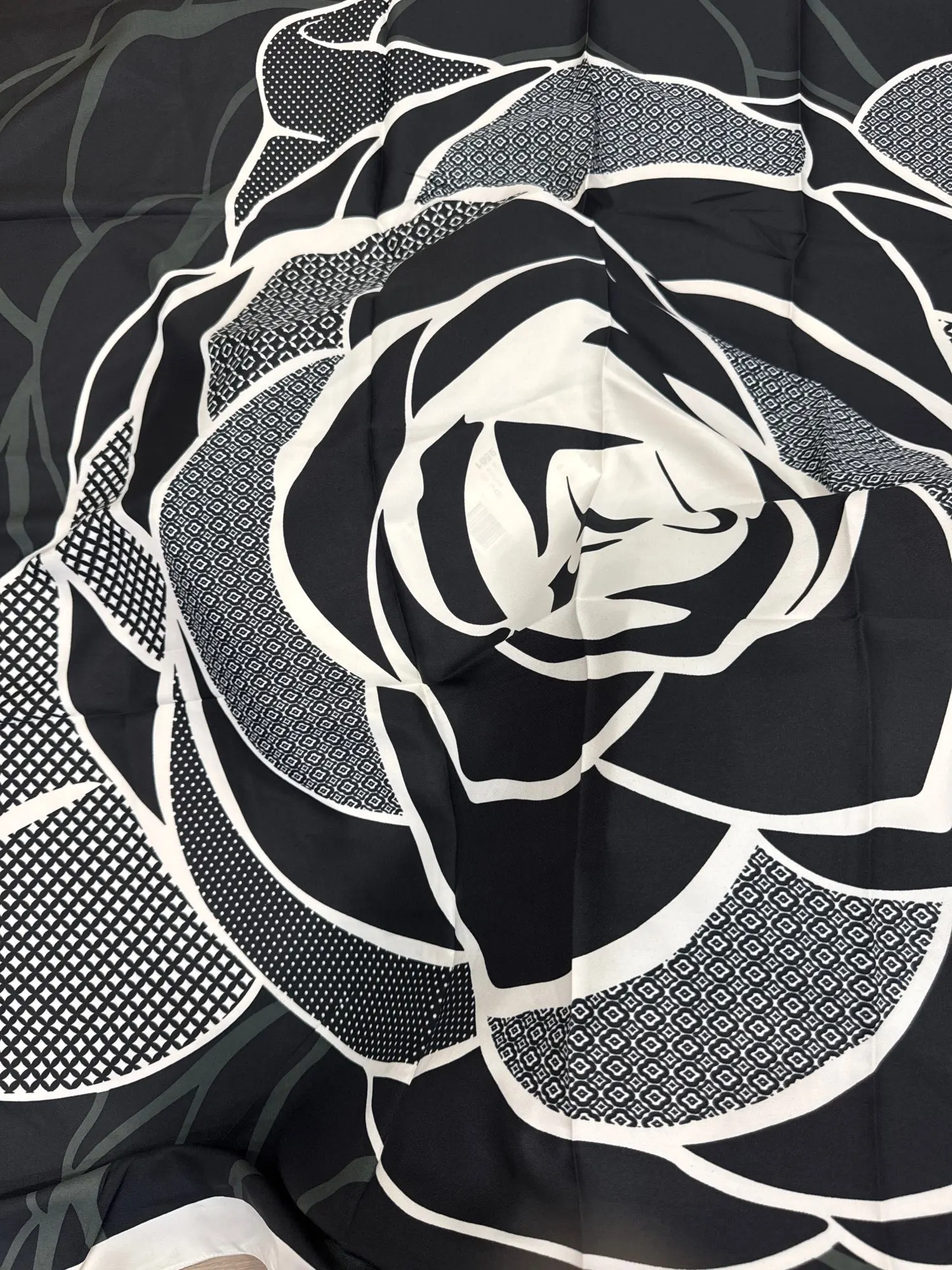 Beautiful scarf! I bought this scarf to wear as a top under jackets. I tried it – looks great! The width is sufficient! This is not silk; rather, it’s 100% synthetic yarn. but I like how the material feels against the skin, even though it’s synthetic.