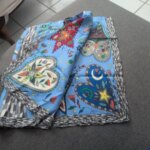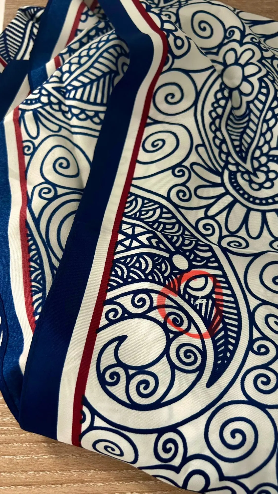 Beautiful handkerchief, dark blue with dark red ornament. Matches well with dark blue jeans. Not super shiny synthetic fabric. It is large enough to tie at the head / waist. There are minor printing errors. For the price, it’s great.