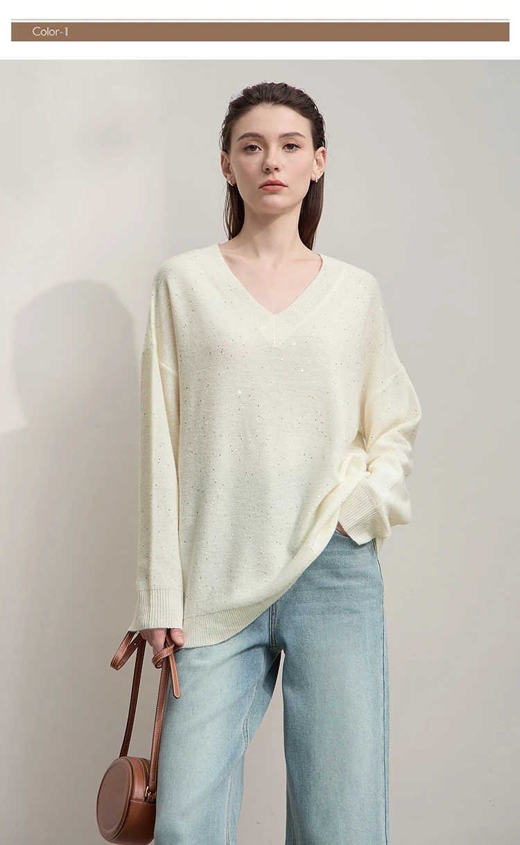 AMII Ladies Sweater 2025 Autumn New Woman Clothing Solid Color Casual V-neck Pullover Long Sleeves Loose Tops For Woman 12543180