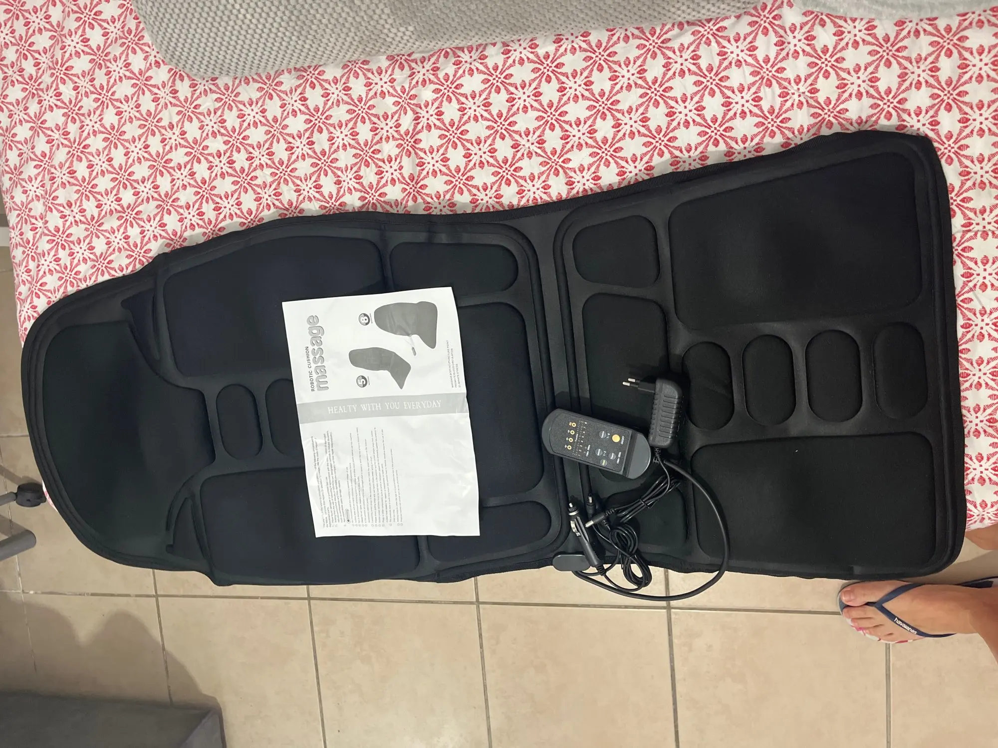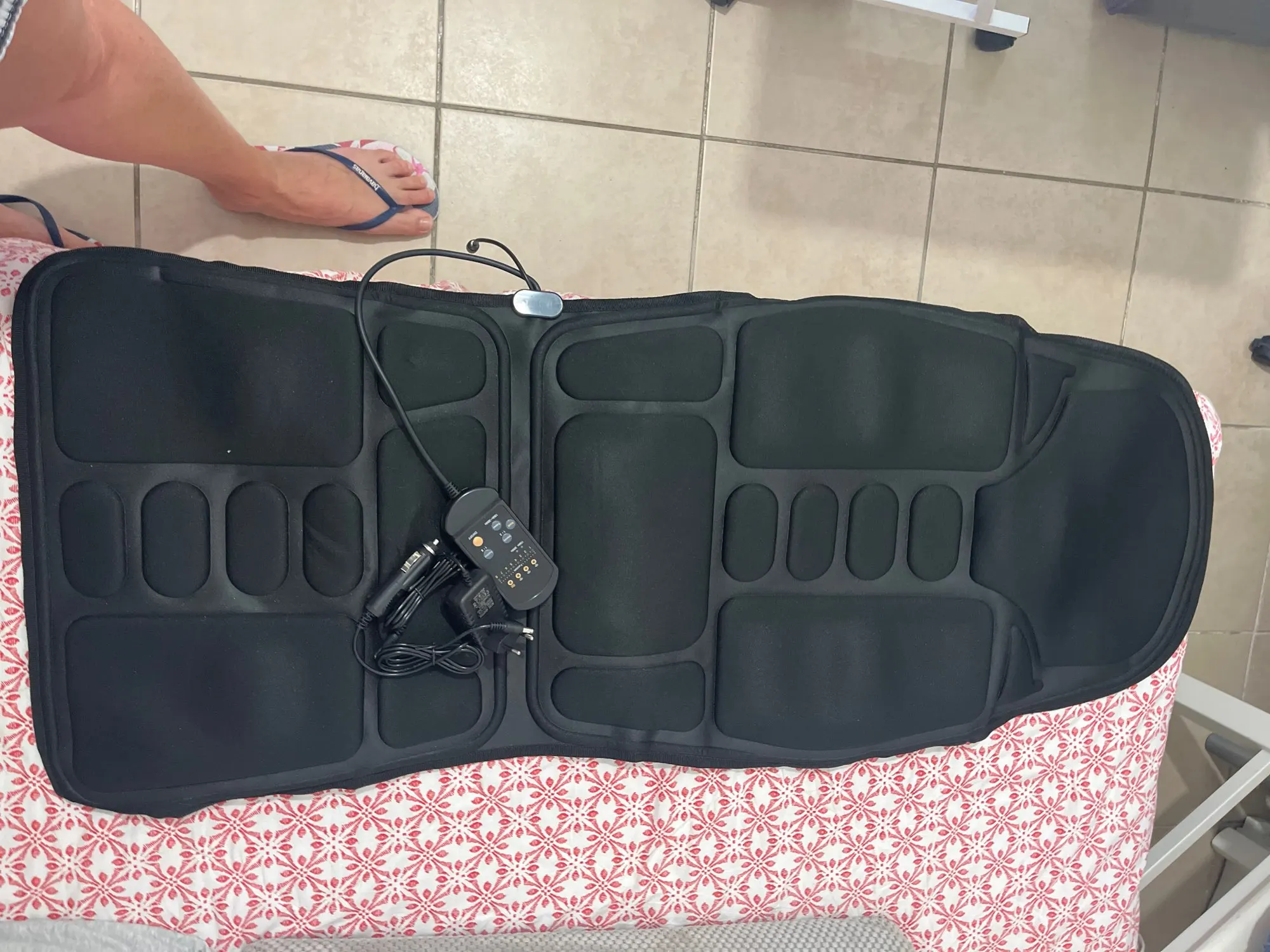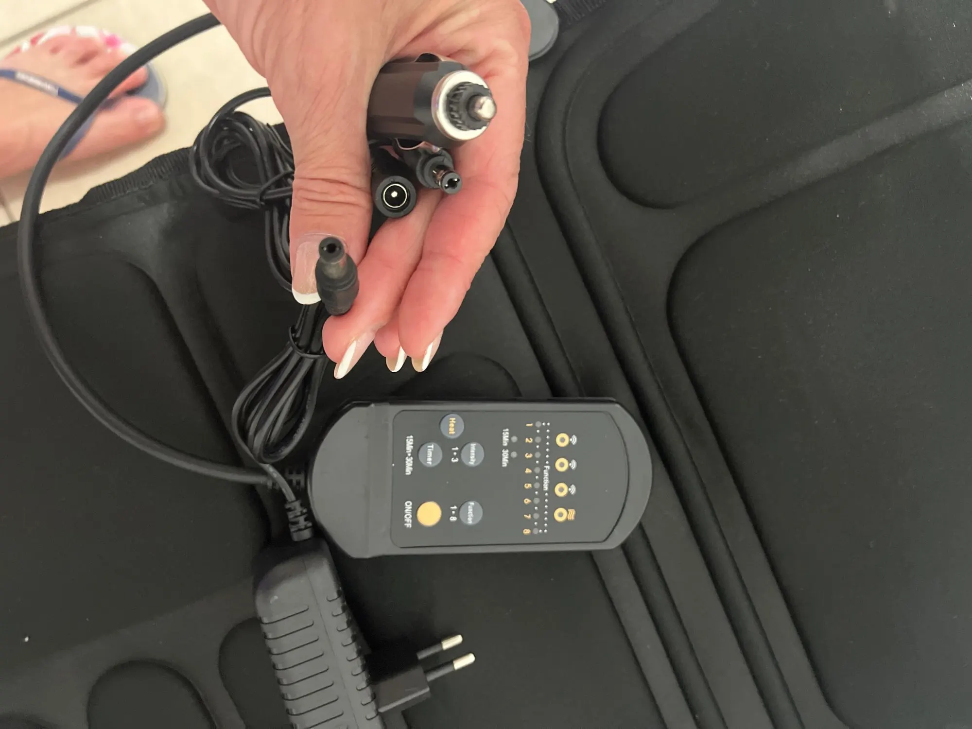the rug is awesome!! Made with very high quality, there are elastic bands on the back for attaching to the chair. Works on the network, Euro plug. There is also a separate cable for connection in the car. Many different modes from weak to quite strong. really relaxes!