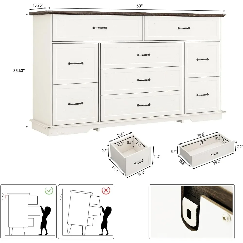 - Multi-Purpose 63″ W Large 9 Drawer Dresser:Can be used as a Drawer Dresser that combines beauty and functionality can be versatile as the tv stand for the living room, Coffee Wine Bar for the dining room, sideboard buffet cabinet in the living room,Transform your be Bedroom from cluttered, hard-to-reach spaces into efficient, organized storage havens.