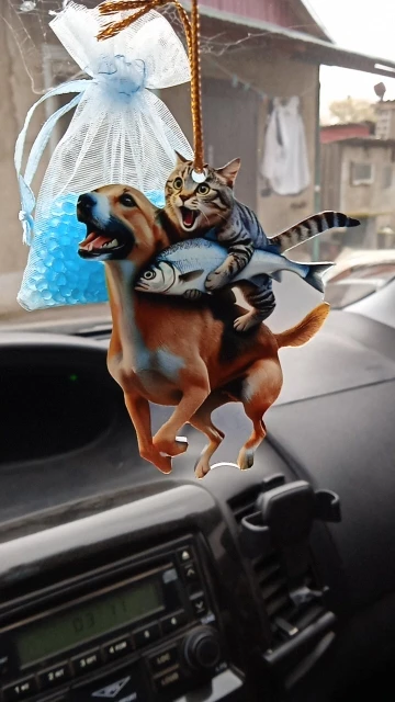 Swimming cat on a towel, butterfly on a mirror for the driver in the car. Delivery took a while, but nothing like that.