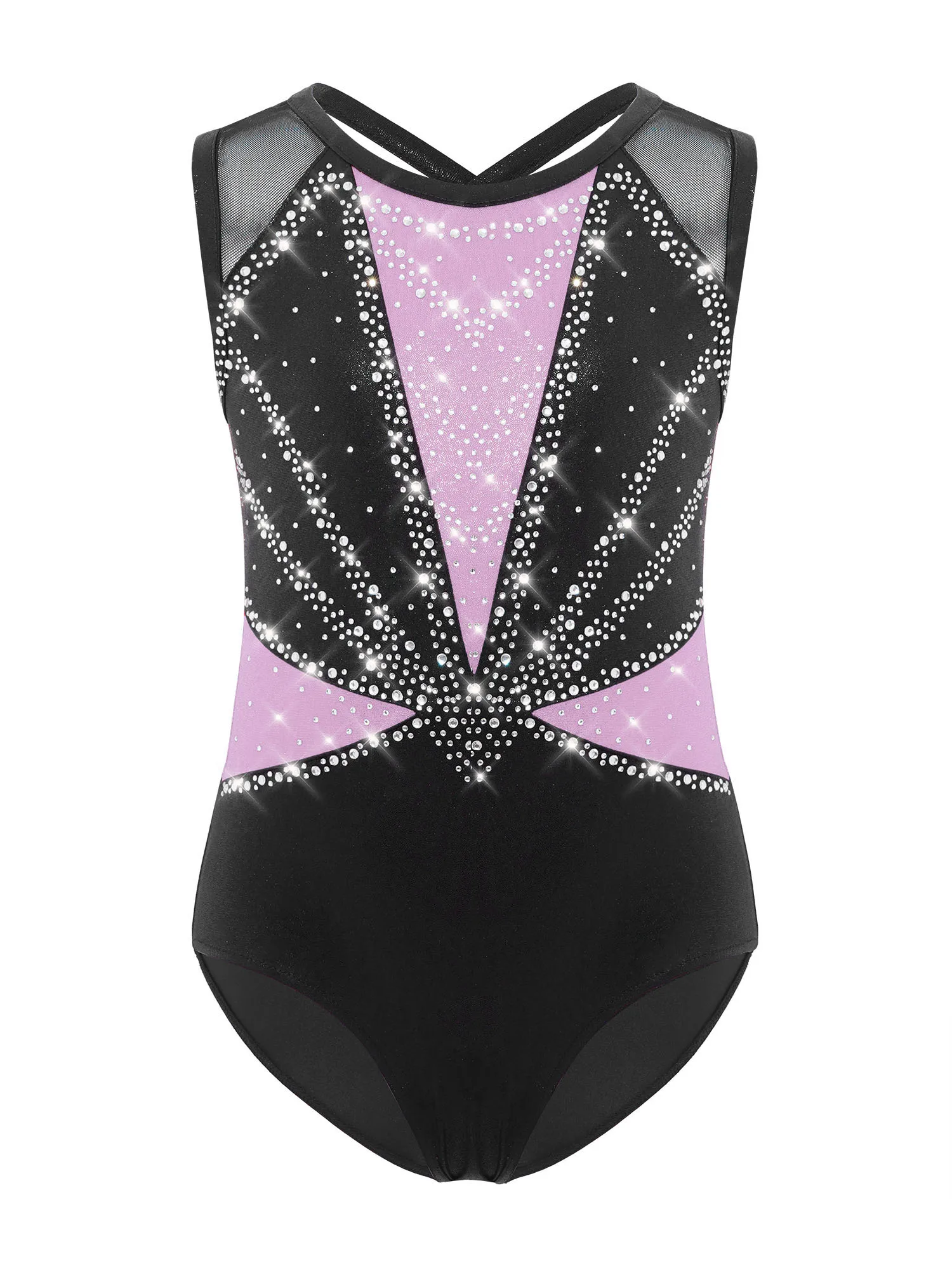 Girls Jazz Dance Performance Costume Round Neck Sleeveless Crisscross Back Shiny Rhinestones Color Block Gymnastics Leotard