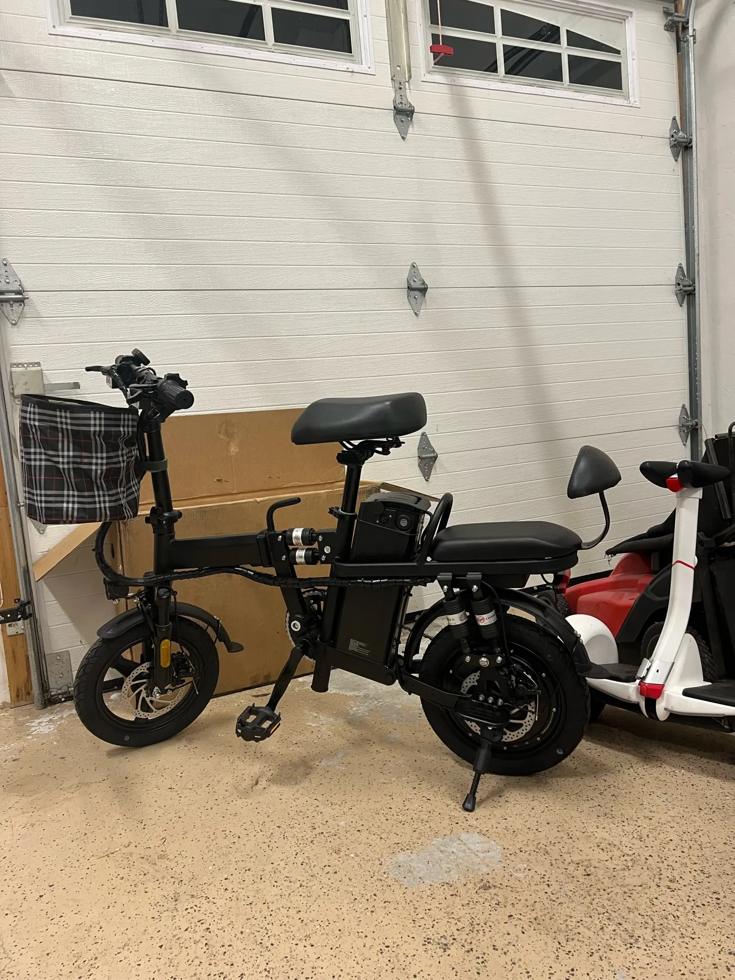 Height&Weight: This 14″ electric bike for adults is designed to accommodate most riders within a height range of 150–180 cm (4’9″–5’9″) and a maximum weight of 150 kg (330 lbs). The 2 seater electric bike can comfortably seat two individuals. The front seat features adjustable height, and the back seat includes a backrest to prevent falling.
