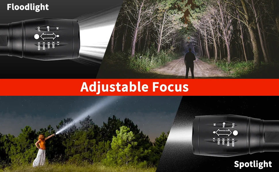 Adjustable Focus – Adjustable focus for use in different situations (just rotate the flashlight head to adjust). The LED flashlight allows you to select focus between spot and flood beams.