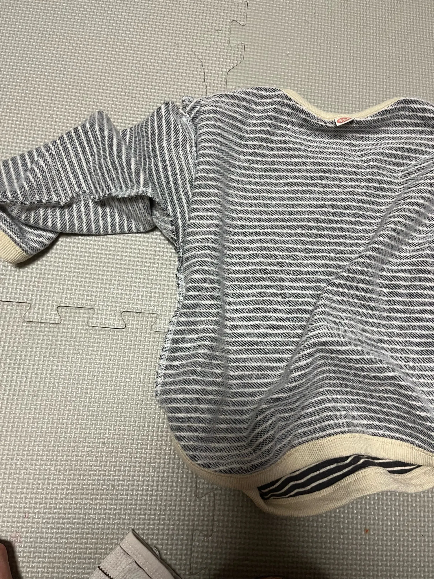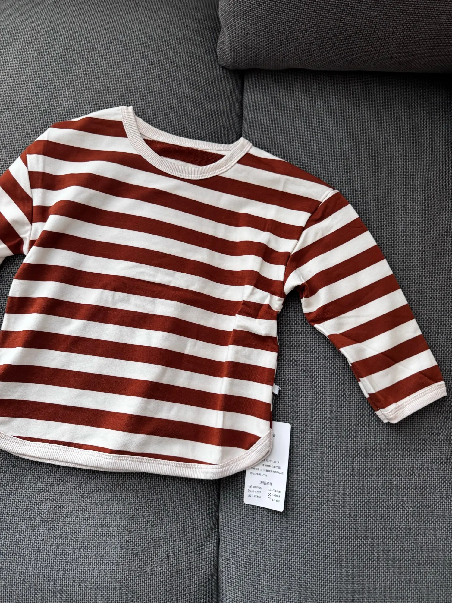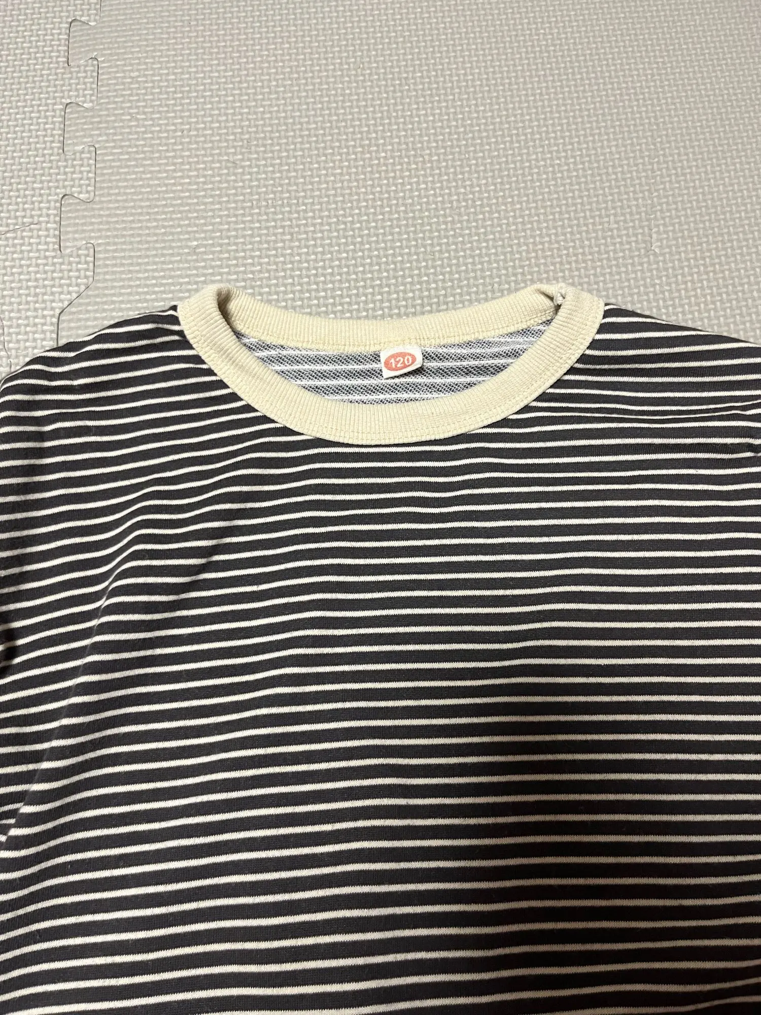 I purchased it for 1,265 yen. The child is 108cm tall and weighs 17.1kg. I bought size 120 and it fits perfectly. It’s a bit uncertain if it will fit next season. The fabric is soft and nice. However, there’s no washing instructions or fabric tags, only size information, which makes it a bit tricky. As a Japanese person, I would feel more secure if there were such instructions. There were no frays or anything like that. I thought it would be better if the ribbing around the neck was a little smaller.