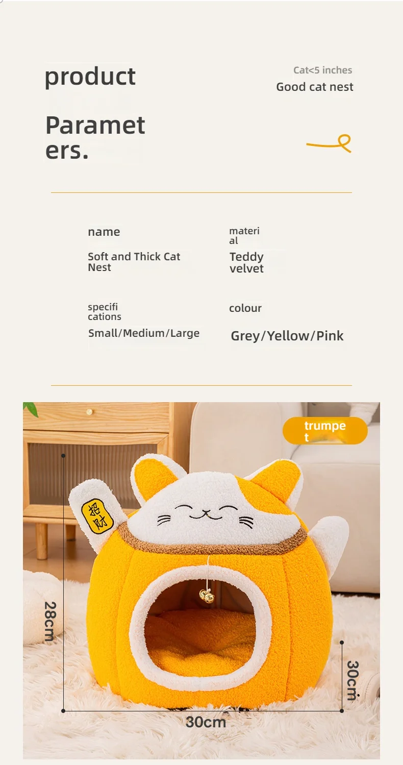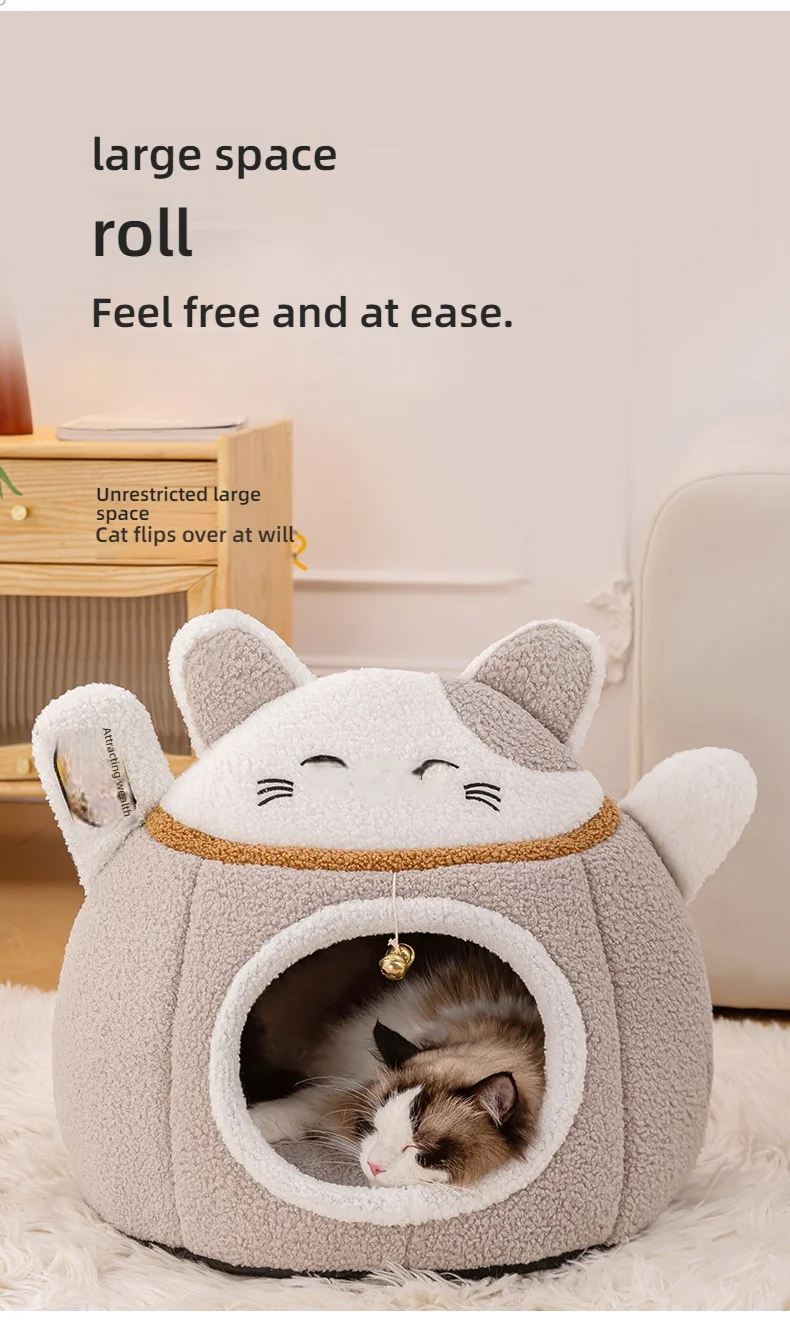 Lucky Fortune Cat Pet Bed – Winter Warm Semi-Open Fleece Round Bed for Cats & Dogs | Cozy Lucky Pet House, Soft Cushioned Kennel