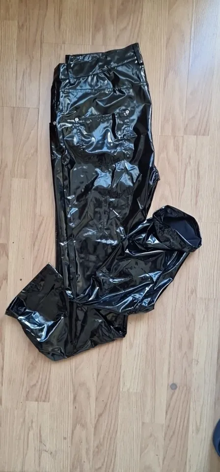 Men Wet Look Patent Leather Pants Glossy Mid Waist Straight Trousers Bar Stage Show Costume.