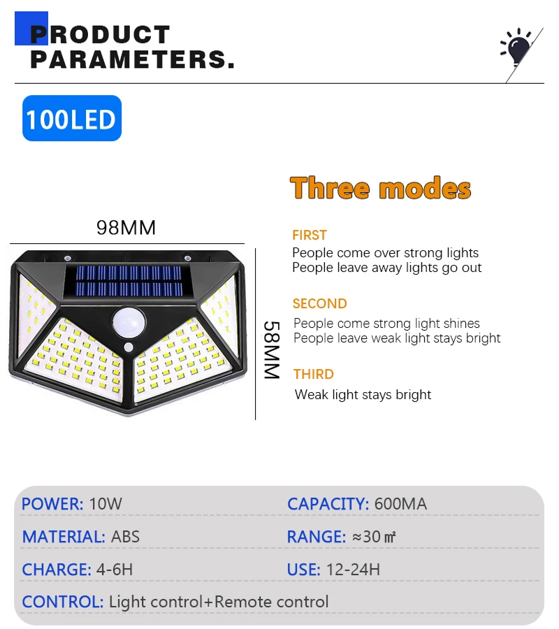 4.【3 Intelligent Modes】The 100 LED Solar Light have 3 Modes, you can choose the perfect mode according to your diverse needs. Medium light mode, Dim light sensor mode and sensor mode.