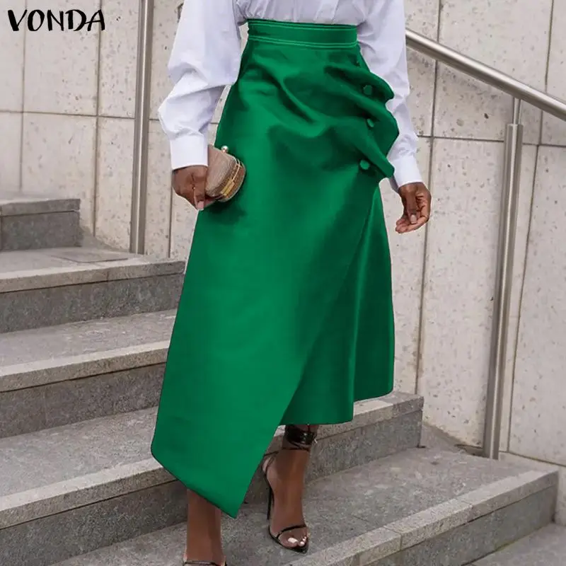 Plus Size 5XL VONDA Elegant Satin Skirts Women High Waist Button Pleated Asymmetrical Maxi Jupes Fashion Solid Long Faldas Saia