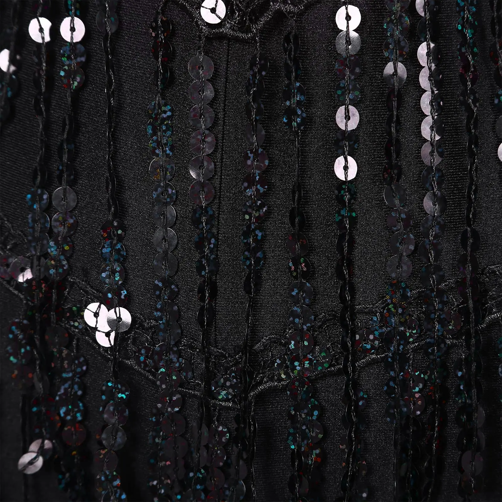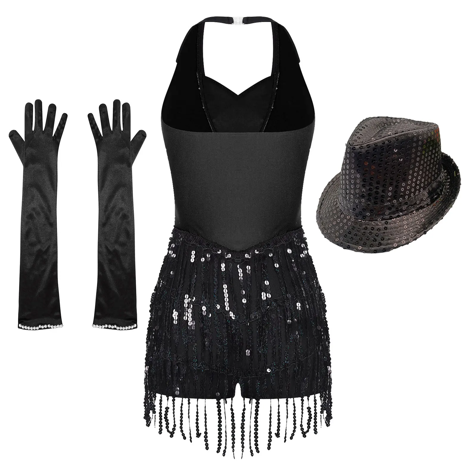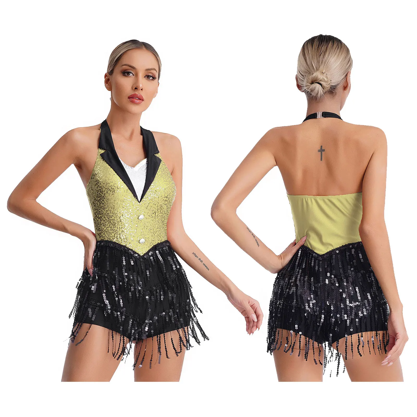 #S-XXL Womens Jazz Latin Dance Performance Outfit Halter Backless Sparkly Sequins Fringe Jumpsuit Sleeveless Tassel Leotard Dancewear with Gloves Hat