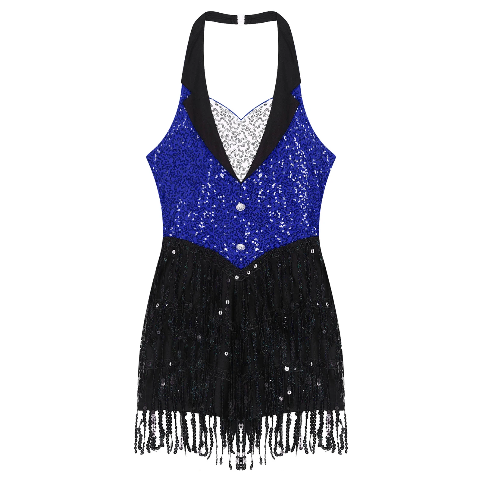 Women Modern Dance Dress Performance Costume Shiny Sequins Sleeveless Latin Jazz Tango Salsa Dance Leotard Bodysuit Dress Outfit