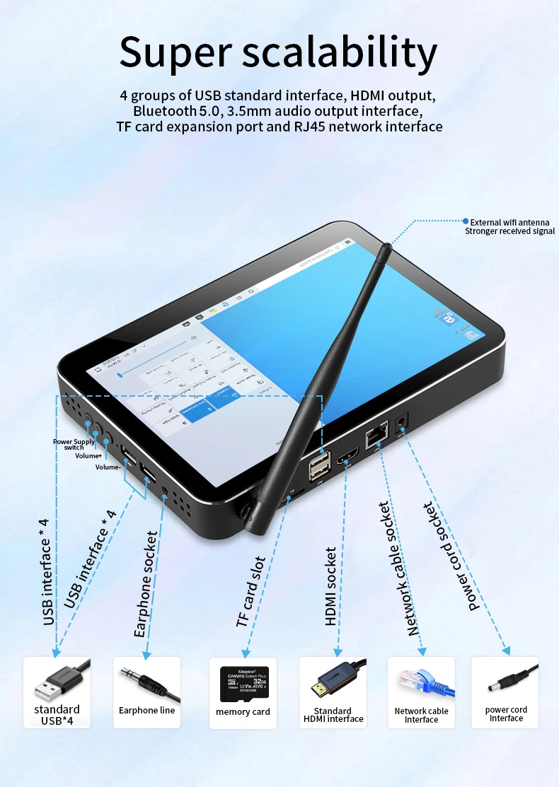 Interface: 4*USB; HDMI output; Bluetooth5.0; 3.5mm headphone jack; TF Card expansion