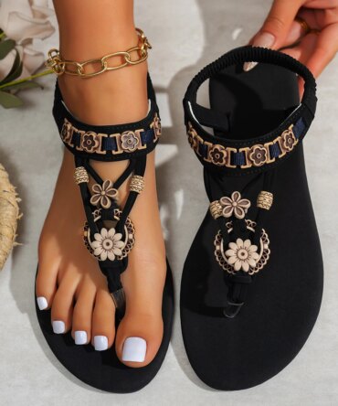 Women’s fashionable round toe clip toe bohemian style one-piece elastic flat sandals