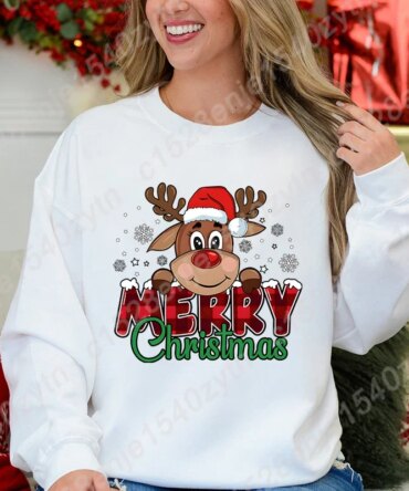Women’s Festive Christmas Reindeer & Plaid Graphic Sweatshirt Casual Loose Fit Long Sleeve Crew Neck Sweatshirts for Winter