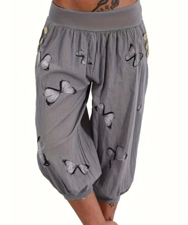 Women’s Plus Size 1XL-5XL Casual Comfortable Capri Pants Fashion Butterfly Print Button Pocket Capri Pants