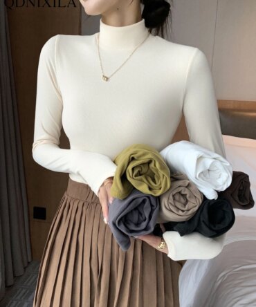 Women’s Knitted Half-Turtleneck Pullover Sweater Elegant Korean Fashion Long-Sleeve Top Slim Fit Thermal Jumper Casual Knitwear