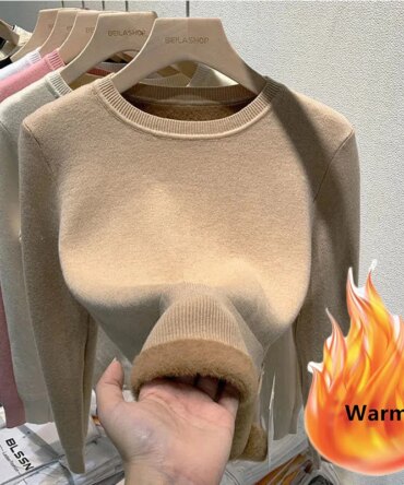 Women’s O-neck Plus Velvet Thicken Sweaters Winter Slim Warm Long Sleeve Knitted Tops Casual Plush Fleece Lined Soft Pullover