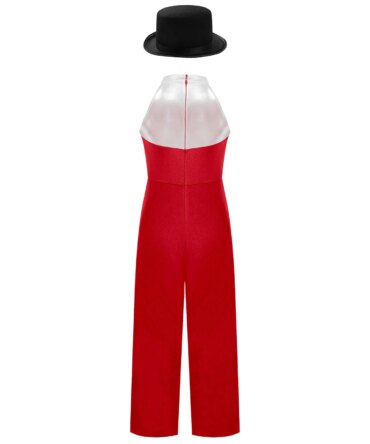 Kids Girls Jazz Dance Stage Performance Outfits Metallic Patchwork Jumpsuit Rhinestone Magician Bodysuit with Felt Top Hat Set